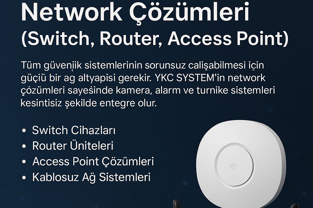 Güvenli ve Kesintisiz İletişim İçin YKC SYSTEM İşletmelerin güvenliği ve sürekliliği için güçlü bir network altyapısı artık bir lüks değil, zorunluluktur. YKC SYSTEM tarafından sunulan network çözümleri, switch cihazlarından router ünitelerine, access pointlerden kablosuz ağ sistemlerine kadar geniş bir yelpazeyi kapsar. Tüm güvenlik sistemlerinin kusursuz şekilde çalışmasını sağlayan bu çözümler, kurumlara sadece güvenlik değil aynı zamanda operasyonel verimlilik de kazandırır.
